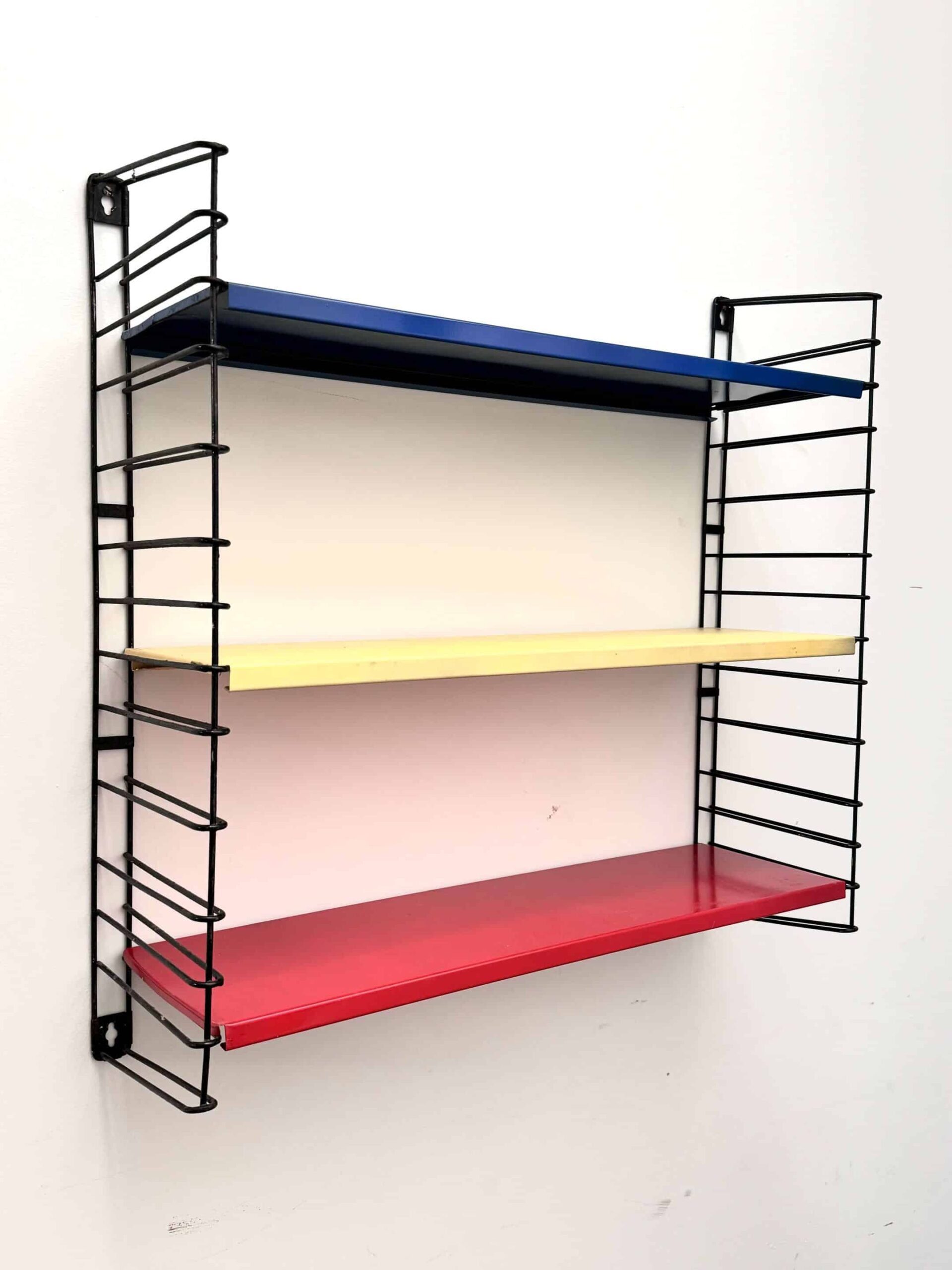 Etagère murale Tomado Holland. Étagère modulable conçue par le designer Adriaan Dekker. Joli meuble design et authentique en très bel état. La structure métallique est composée de 2 montants en métal de couleur noir. Les 3 étagères sont de couleur bleue, rouge et jaune et sont estampillées Tomado Holland. Il s’agit d’une édition originale des années 50. Adriaan Dekker est un designer hollandais du XXème siècle. Son œuvre la plus connue est l’étagère murale dessinée pour Tomado dans les années 1950.