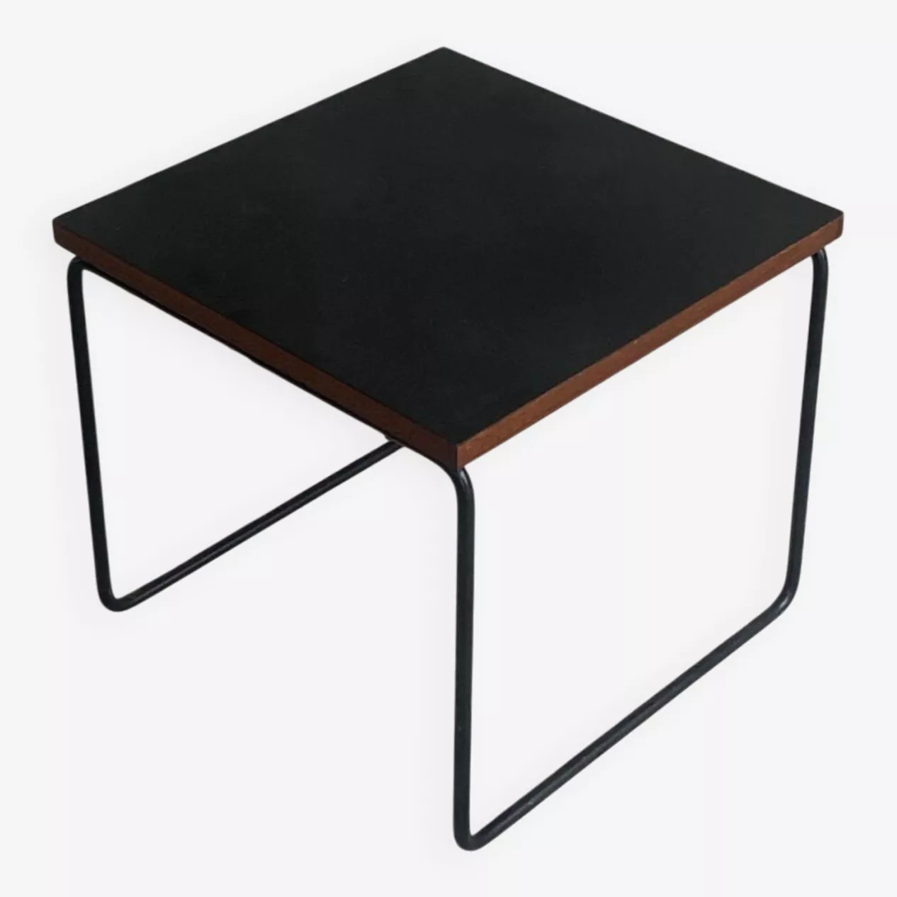 Composé d’un plateau stratifié noir sur un panneau carré en acajou supporté par un piétement métallique tubulaire noir.